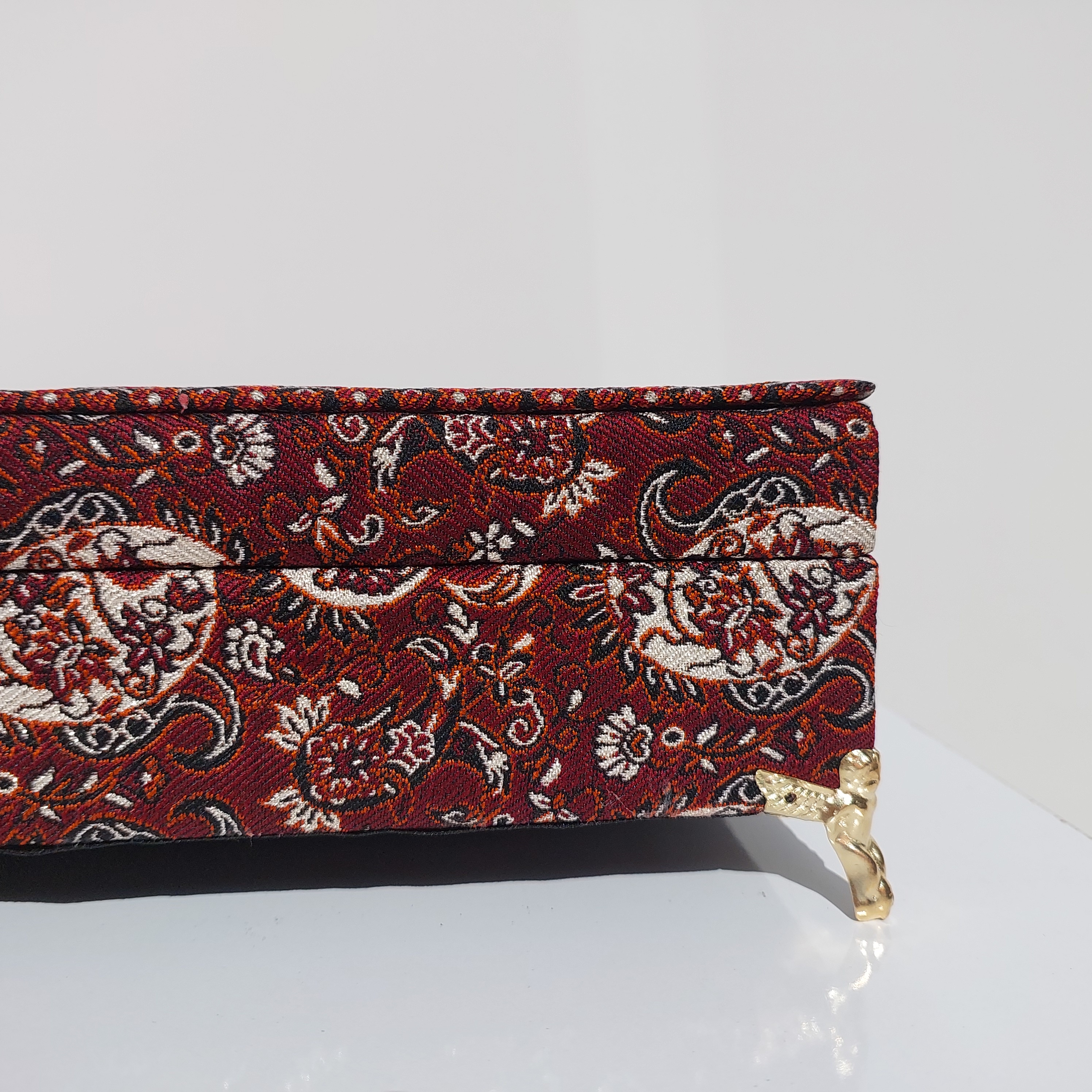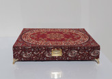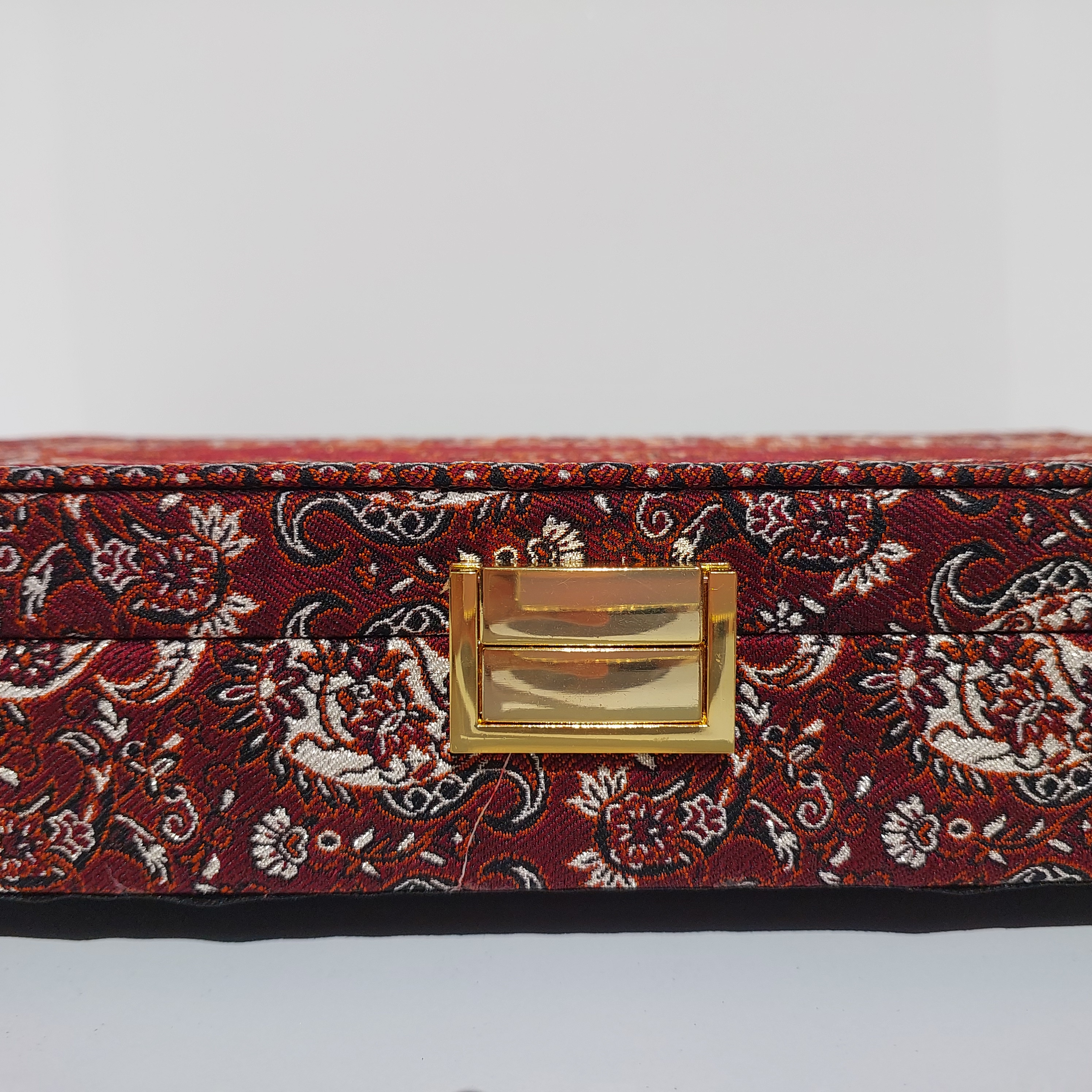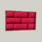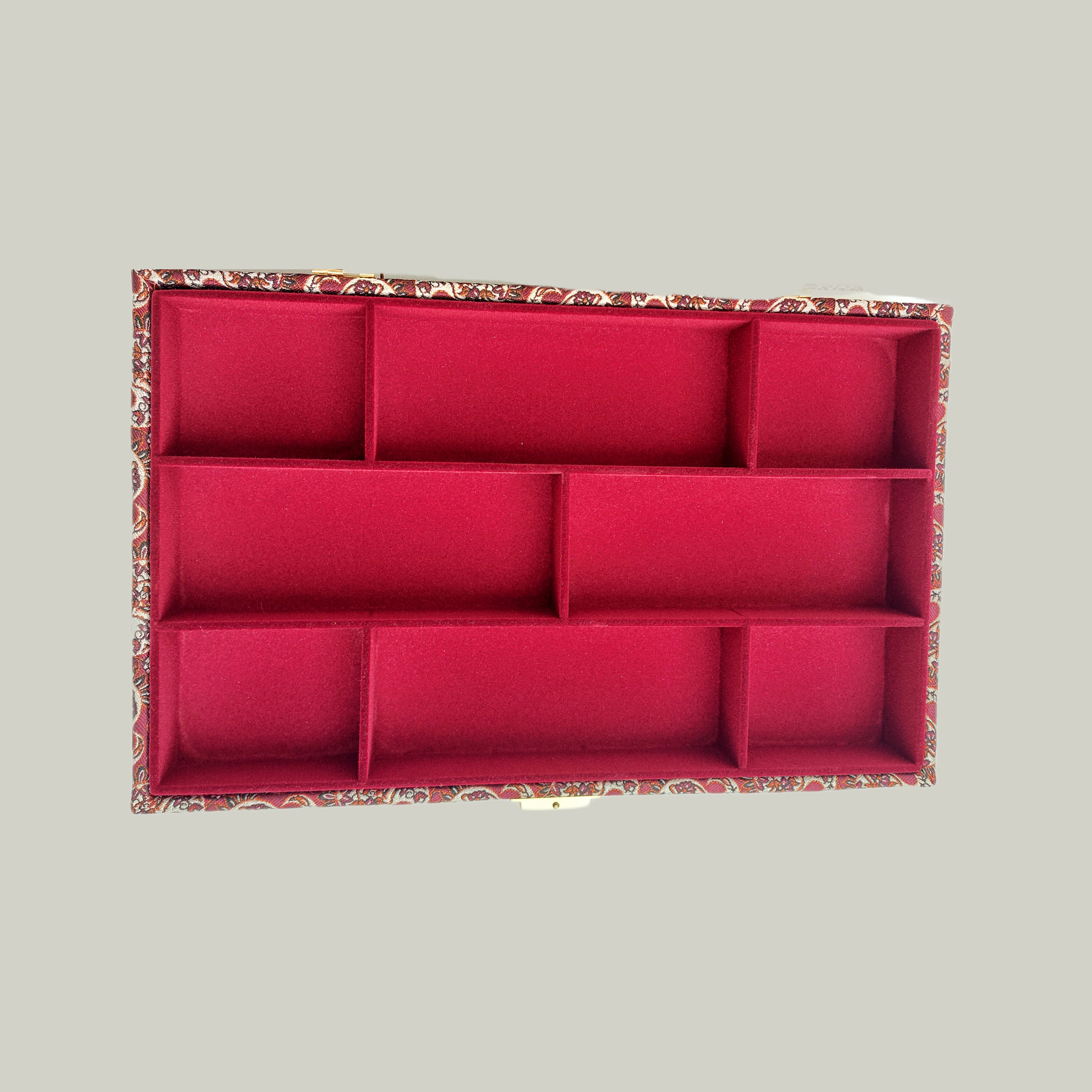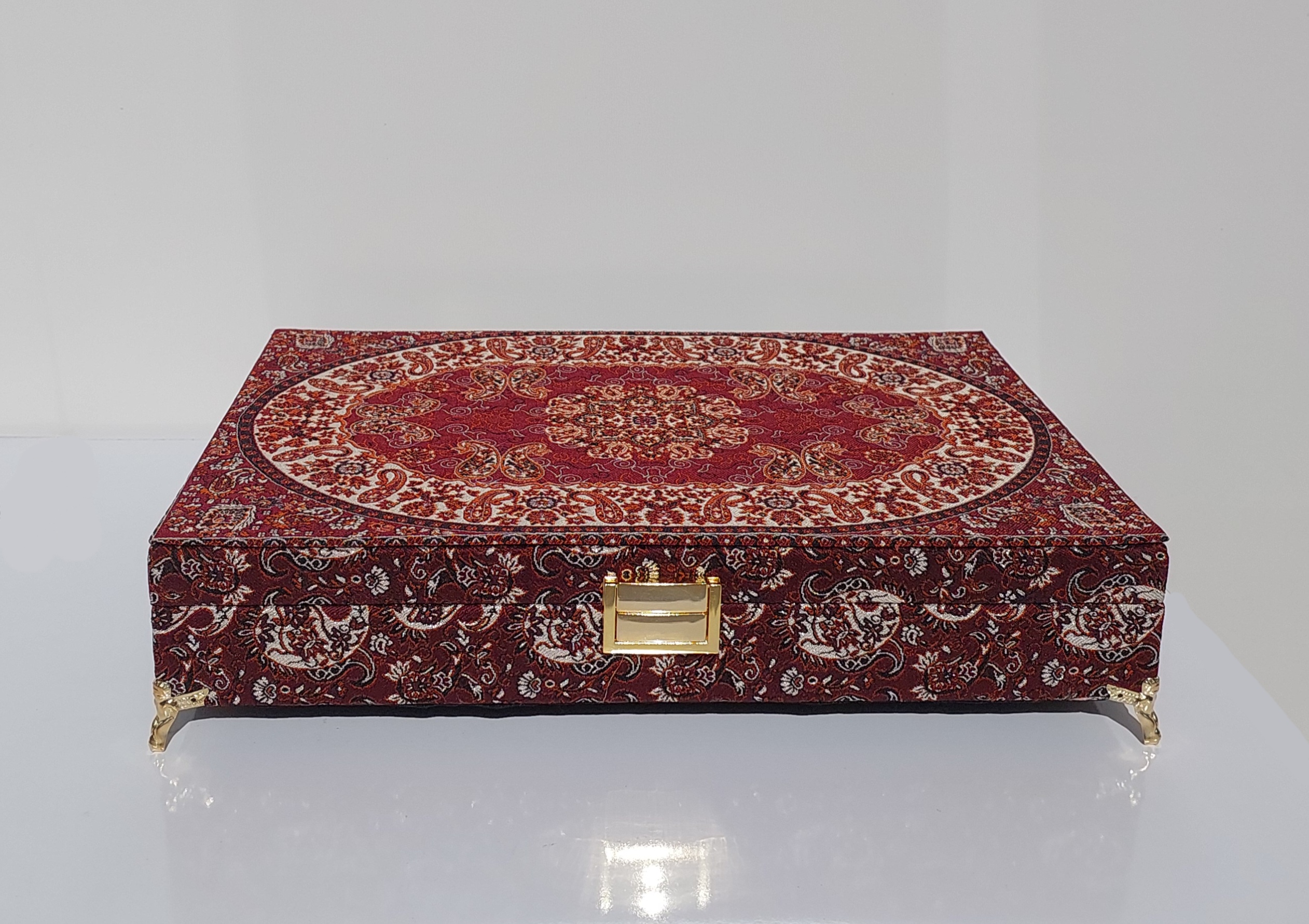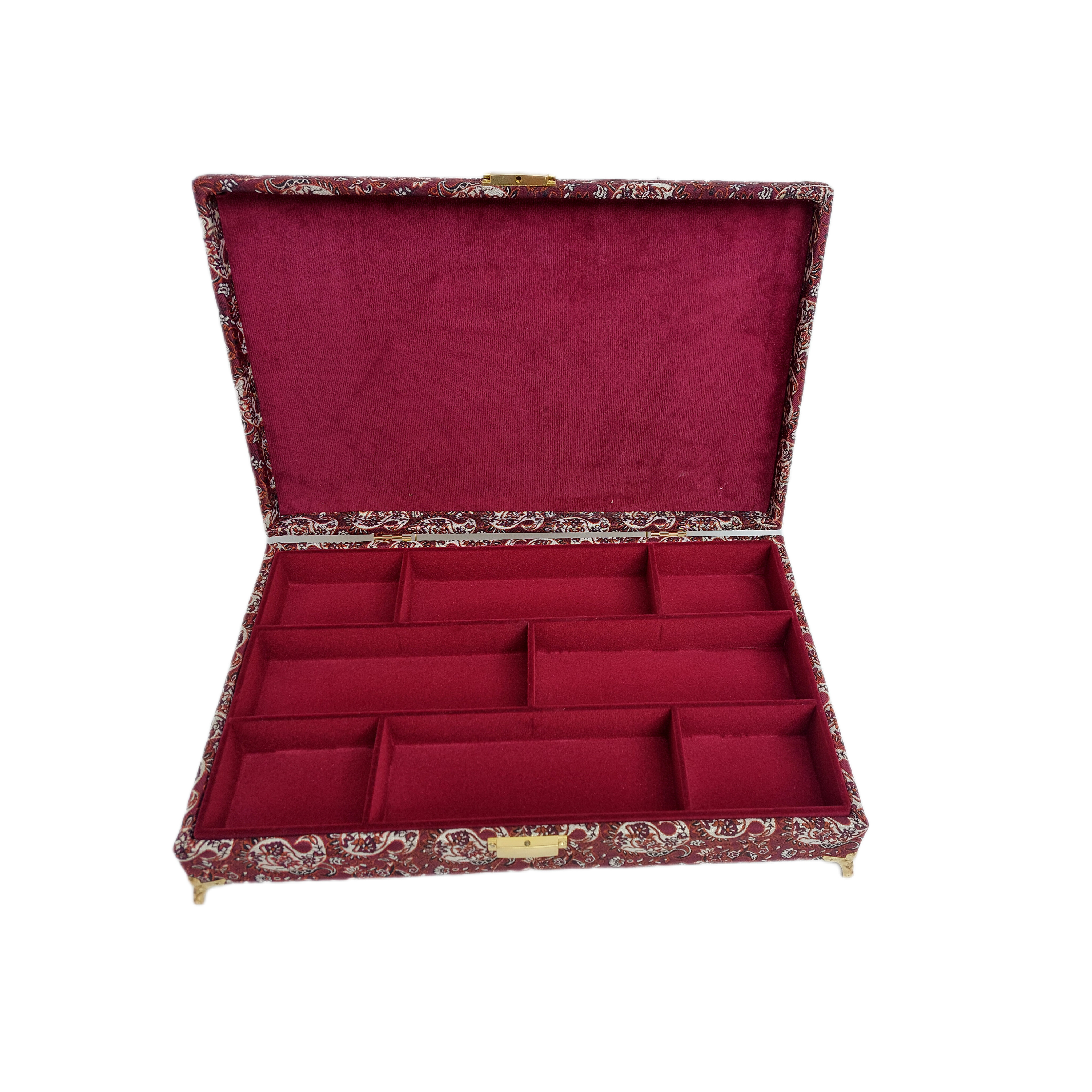 بدنهی آن از چوب MDF مرغوب ساخته شده و داخل جعبه با پارچه مخمل زرشکی لطیف پوشانده شده تا علاوه بر زیبایی، از اقلام داخل آن نیز محافظت کند.